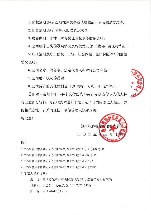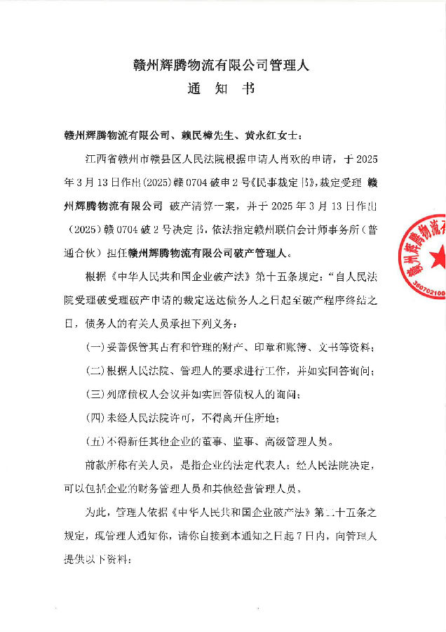 赣州辉腾物流有限公司管理人通知书