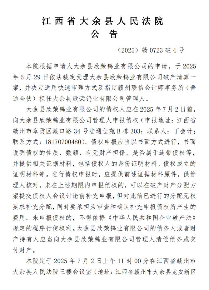 关于大余县欣荣钨业有限公司破产清算债权申报公告