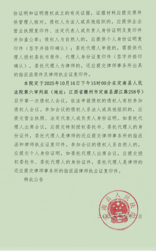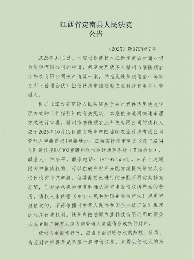 关于赣州市陆陆顺农业科技有限公司破产清算债权申报公告