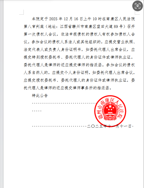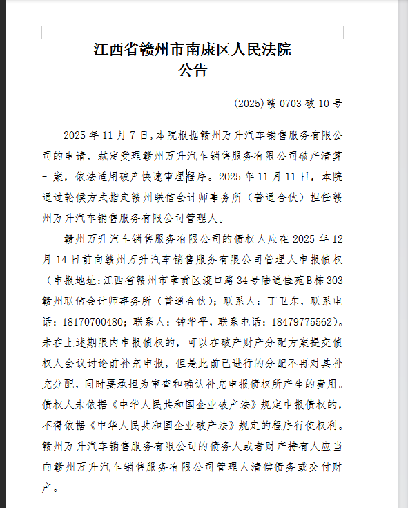 赣州万升汽车销售服务有限公司破产清算案一债会及债权申报公告